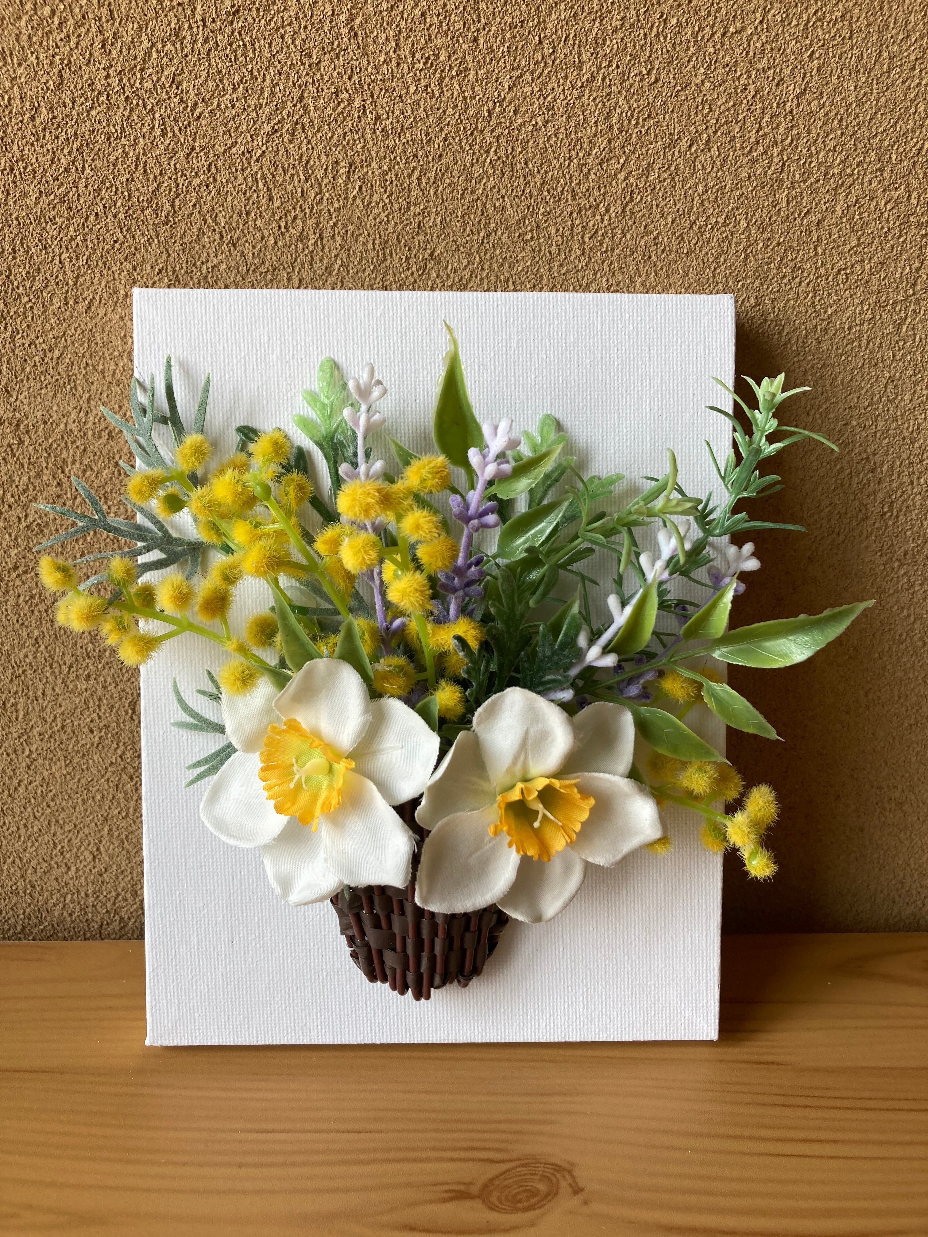 白と黄色を特徴とした、色とりどりの花々を一枚のキャンバスに収めた作品。植木鉢をイメージし、編みこまれたオブジェクトがより存在を引き立たせています。
