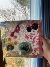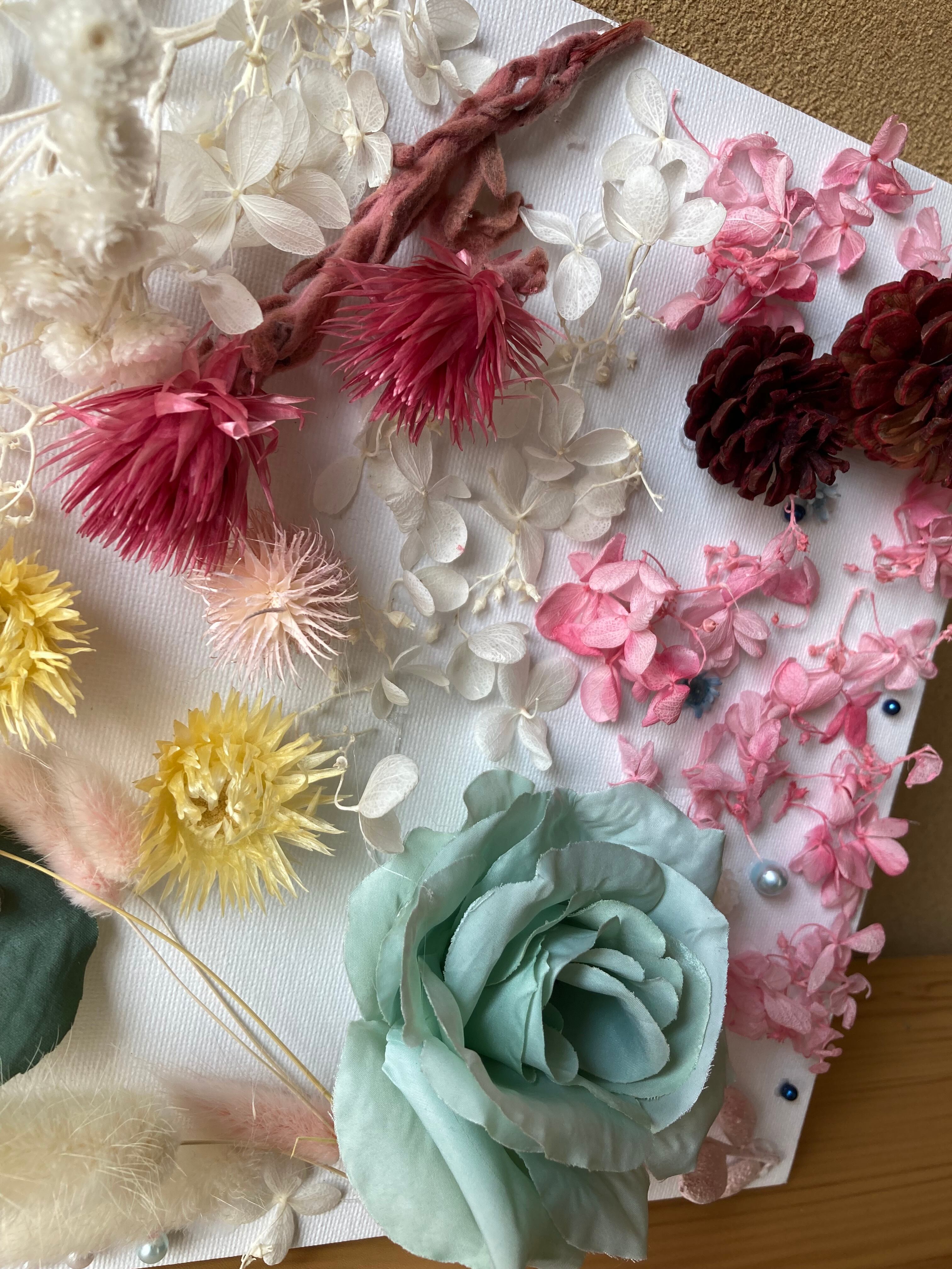 色とりどりの花々やビーズを散りばめた作品です。大きな淡い緑色の花が特徴的です。