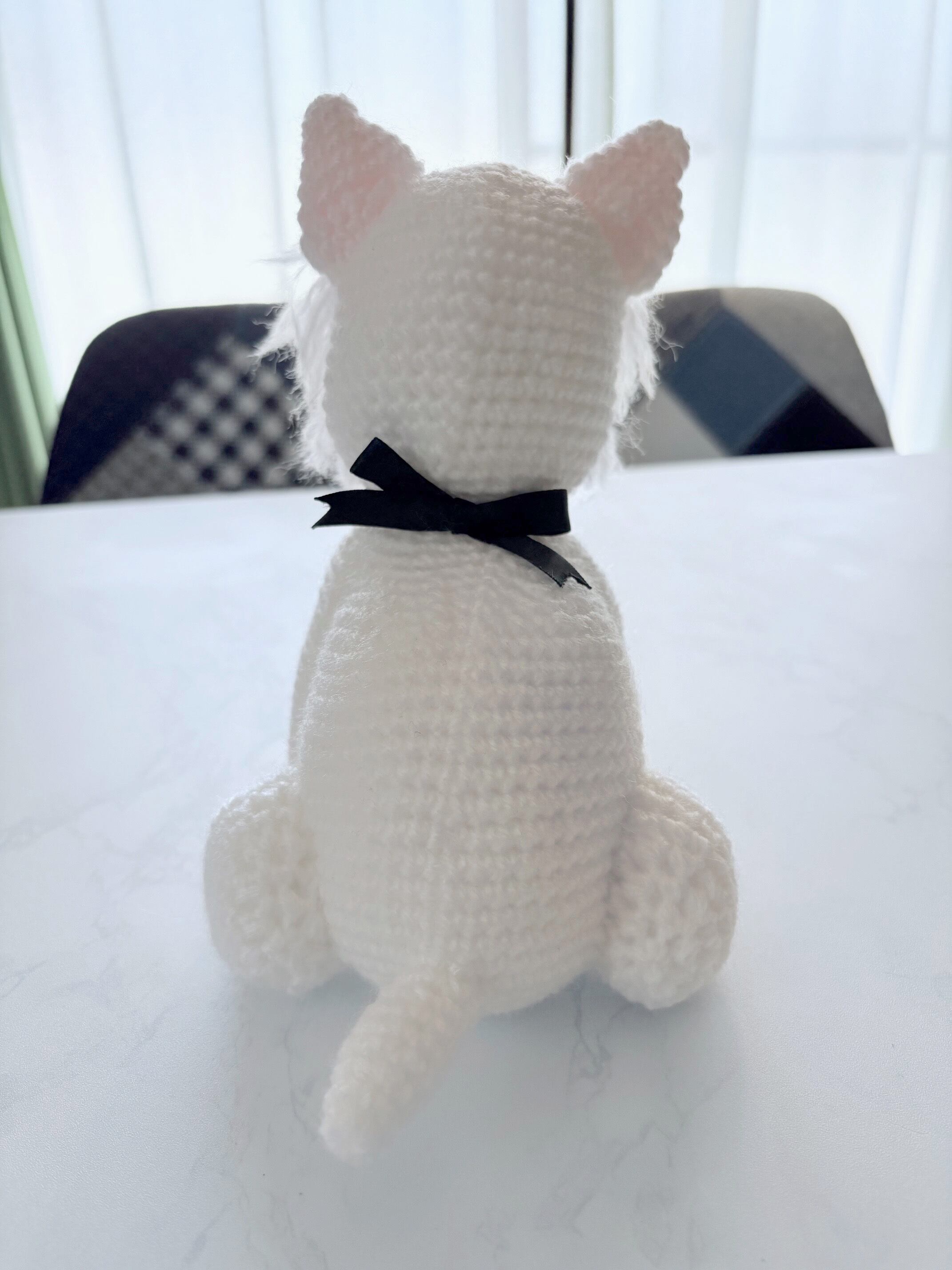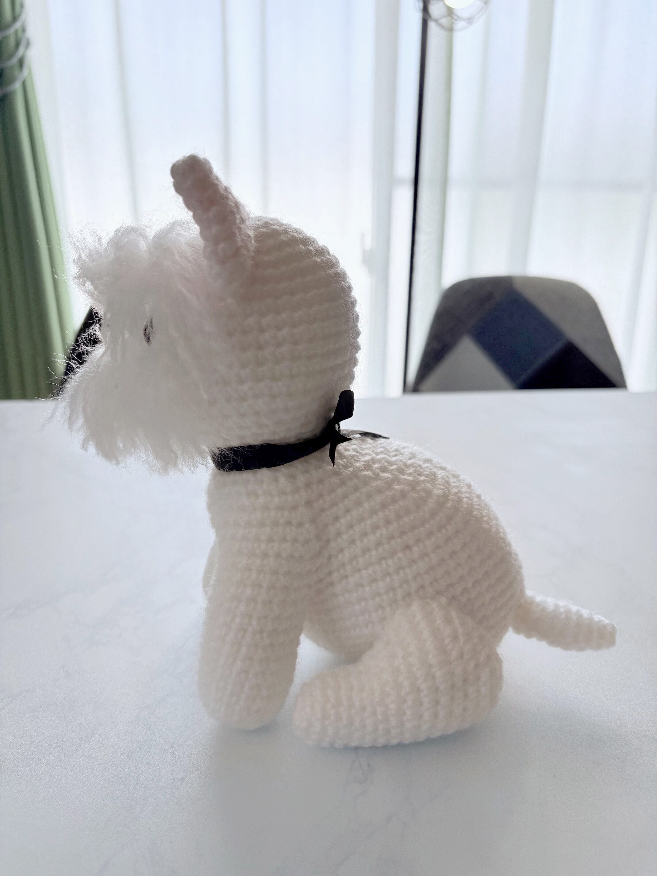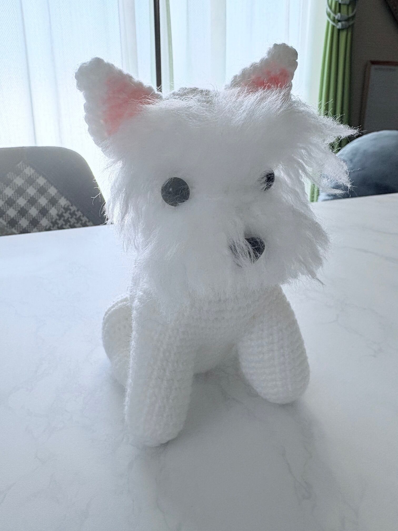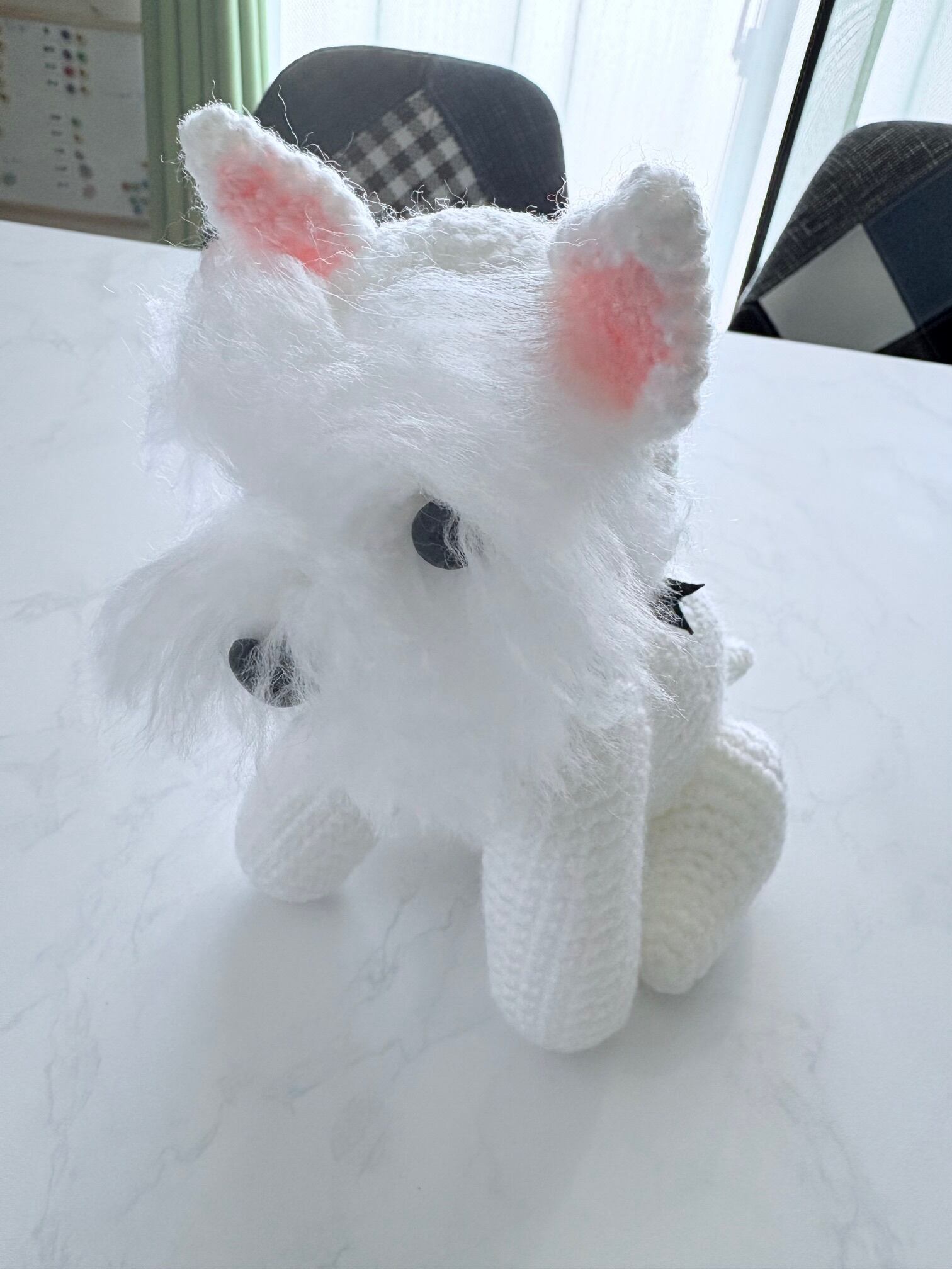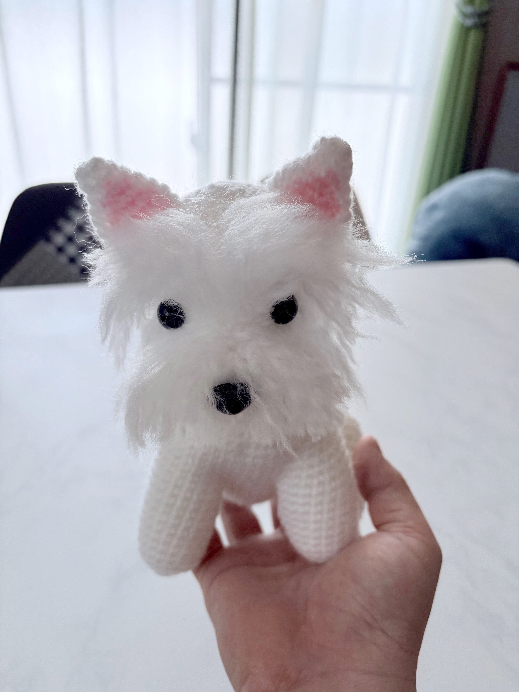 真っ白なもふもふフェイスが可愛らしい、ホワイトテリアのあみぐるみ。