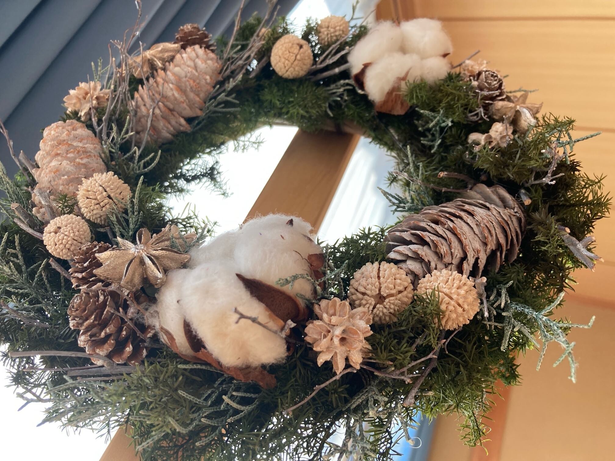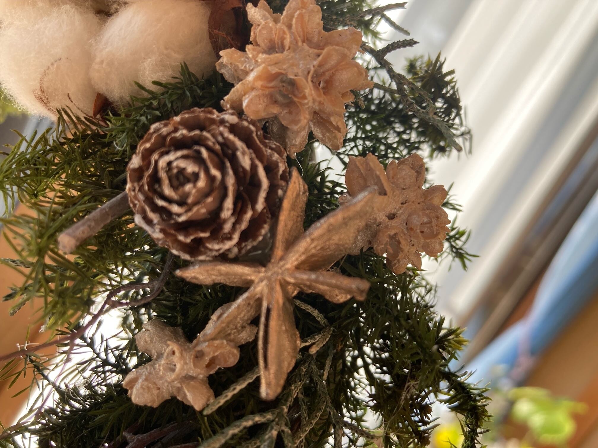 ・シックなホワイトの色合いを基調とし、松ぼっくりや木の実など様々なアクセントが施されています。