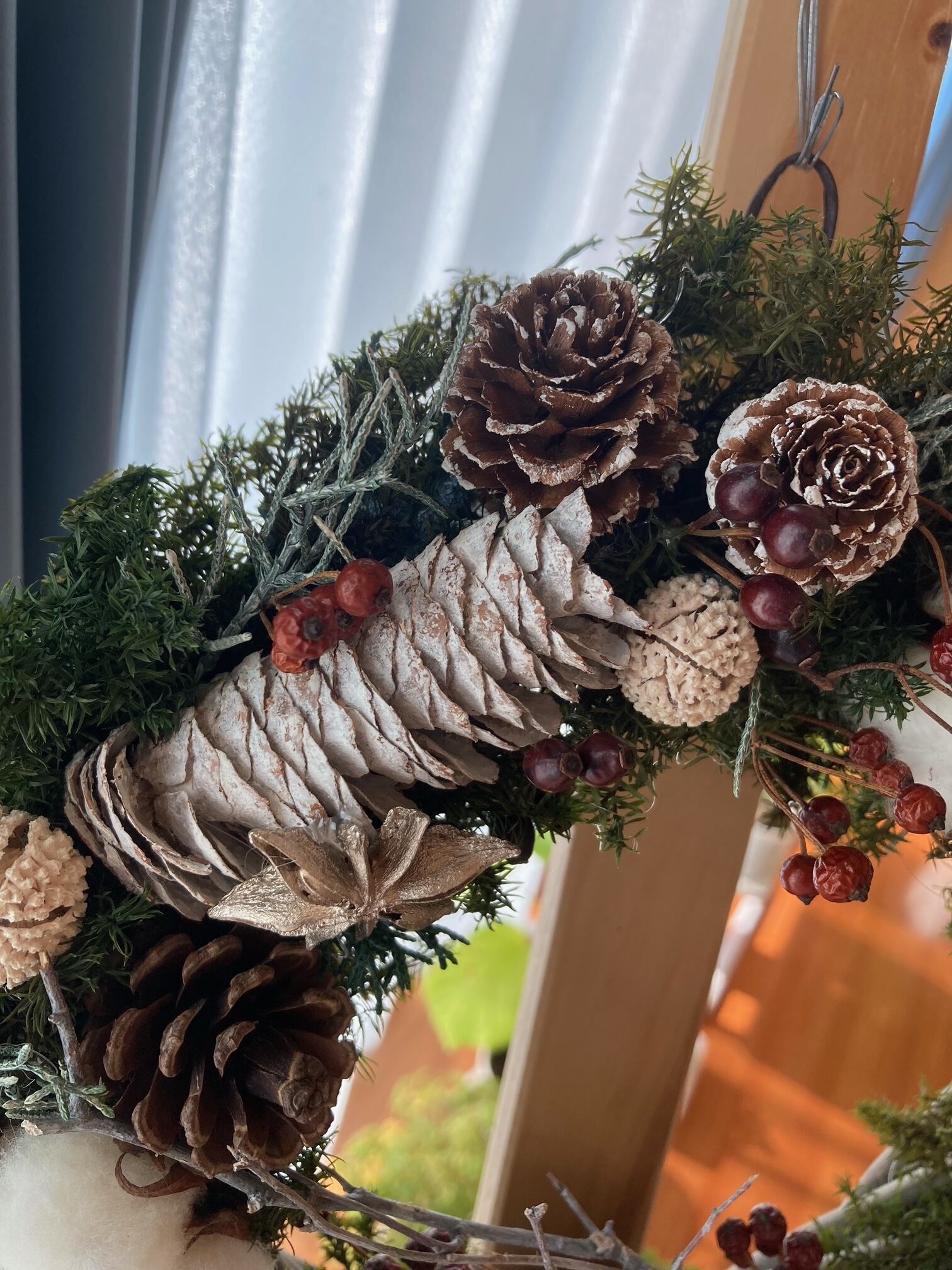・シックなホワイトの色合いを基調とし、松ぼっくりや木の実など様々なアクセントが施されています。