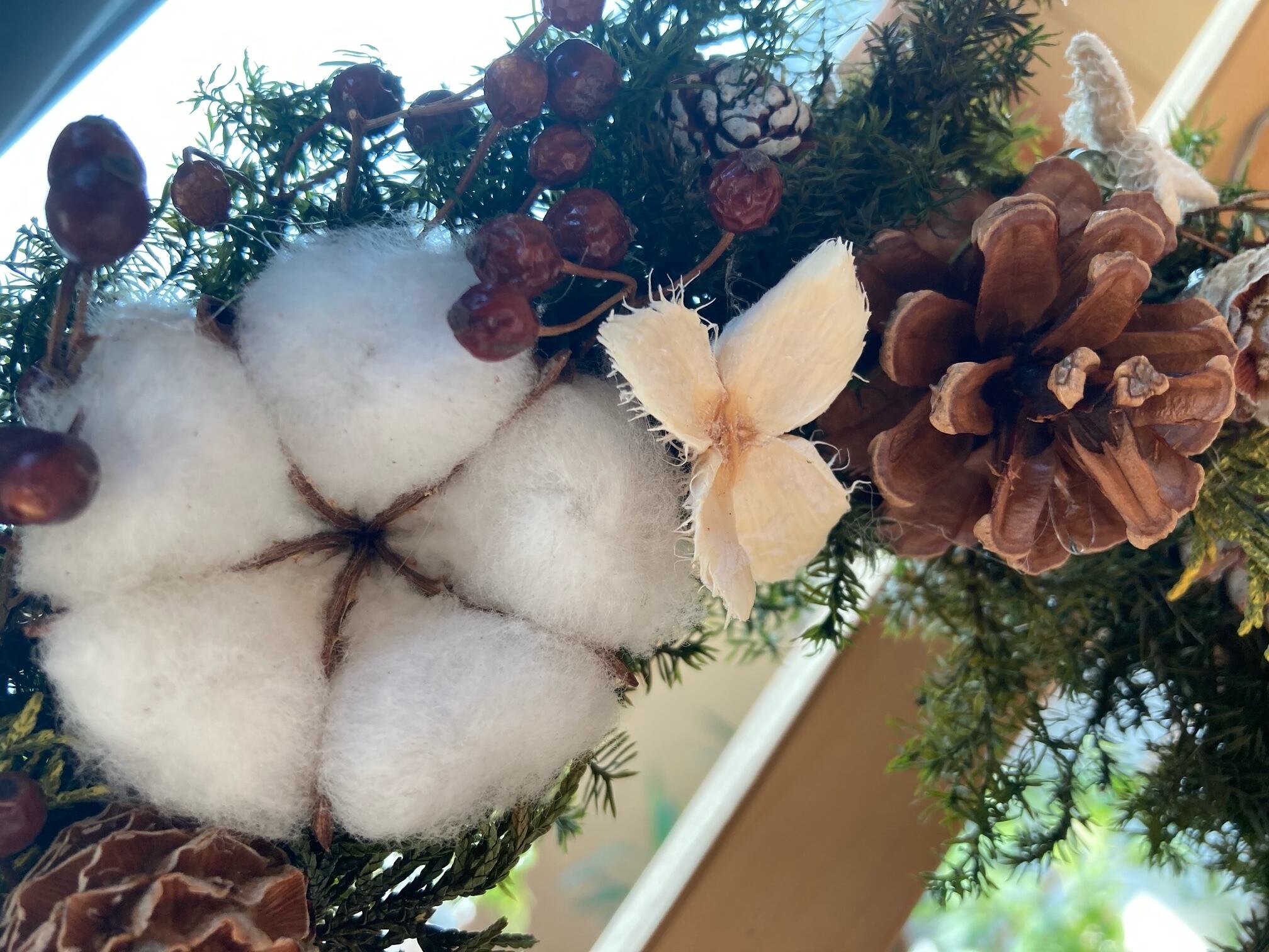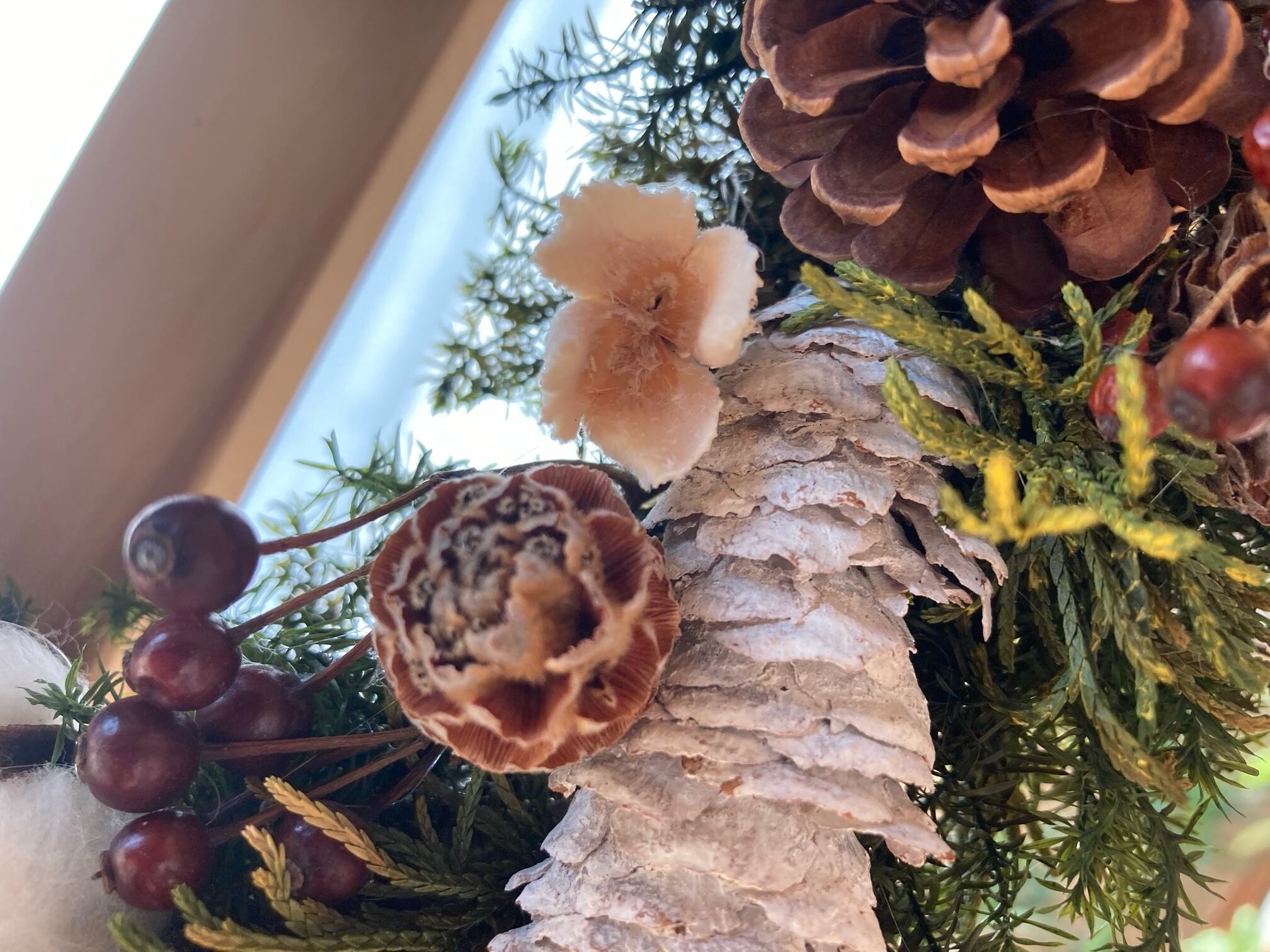 ・シックなホワイトの色合いを基調とし、松ぼっくりや木の実など様々なアクセントが施されています。