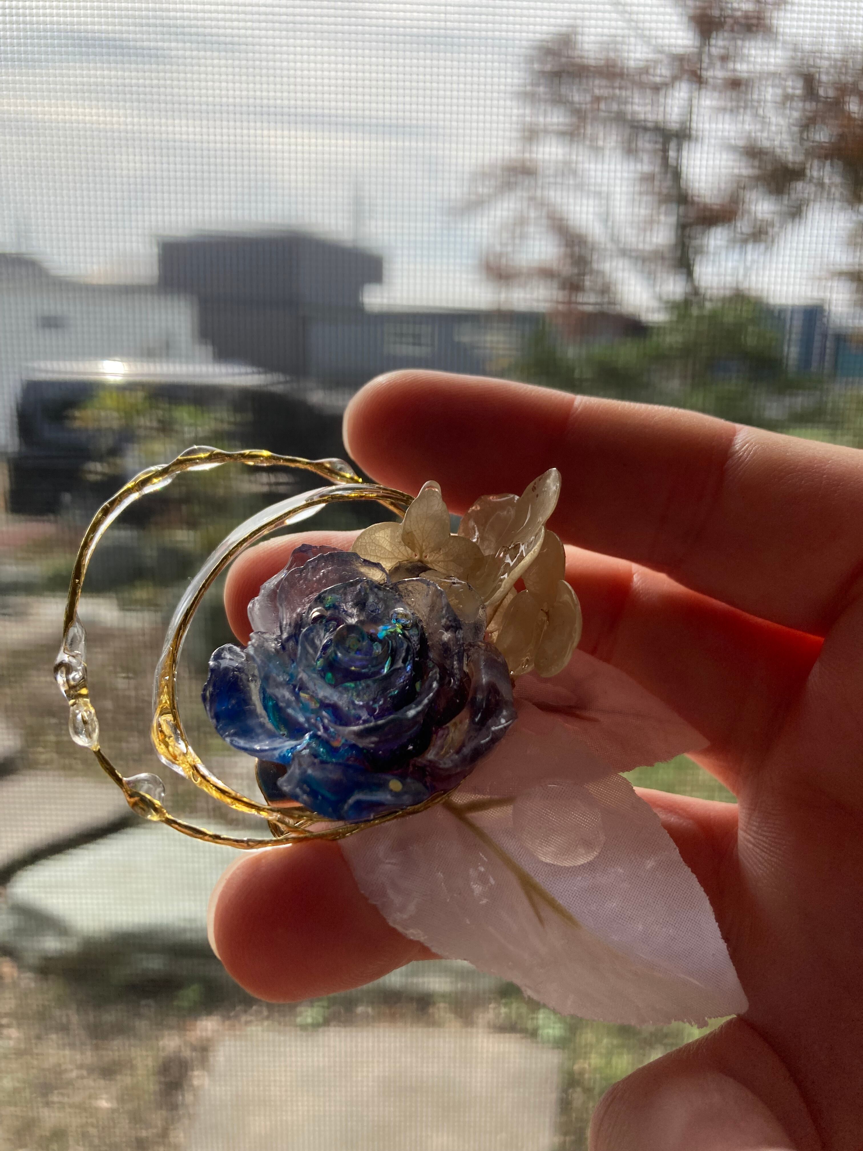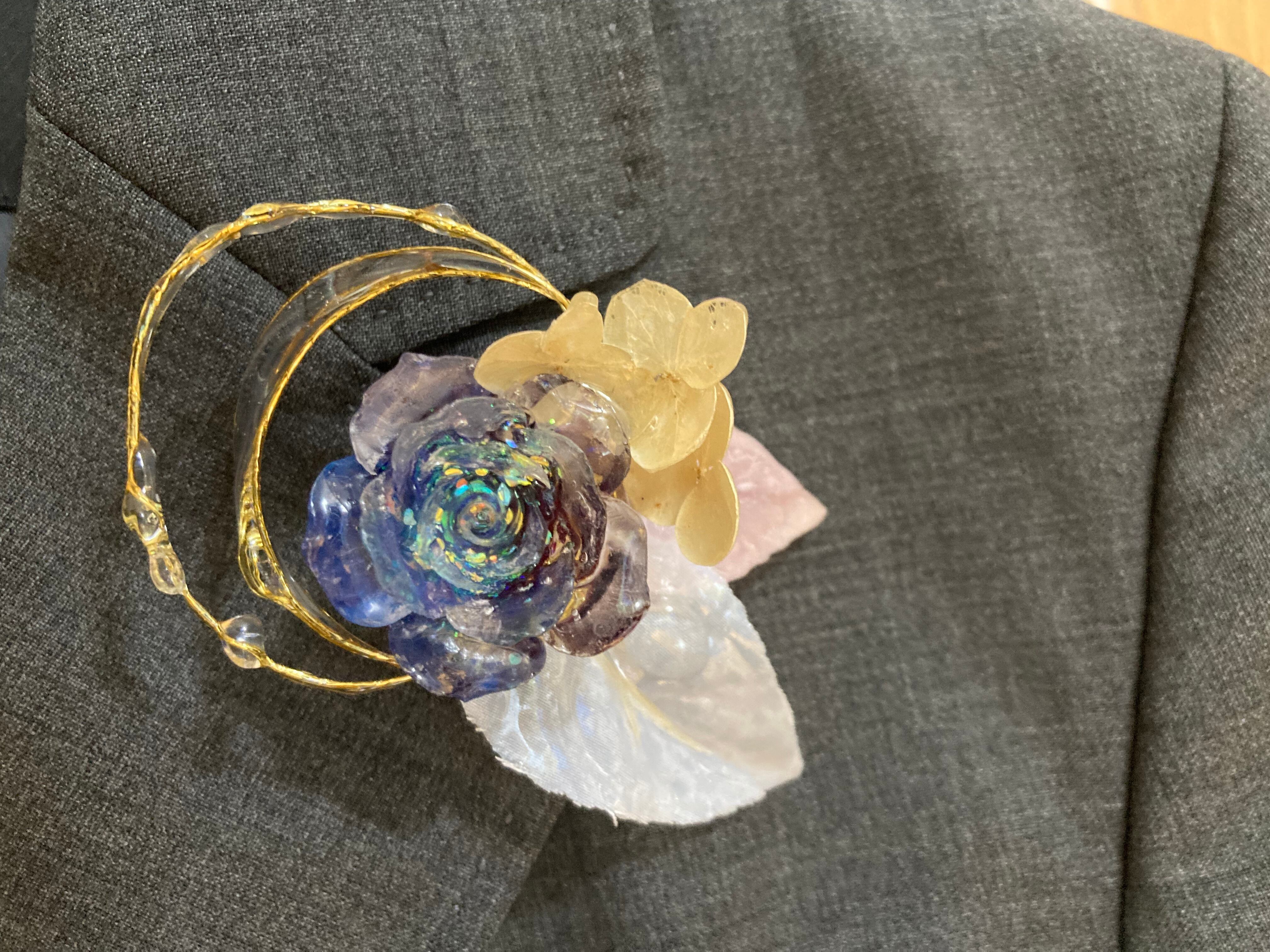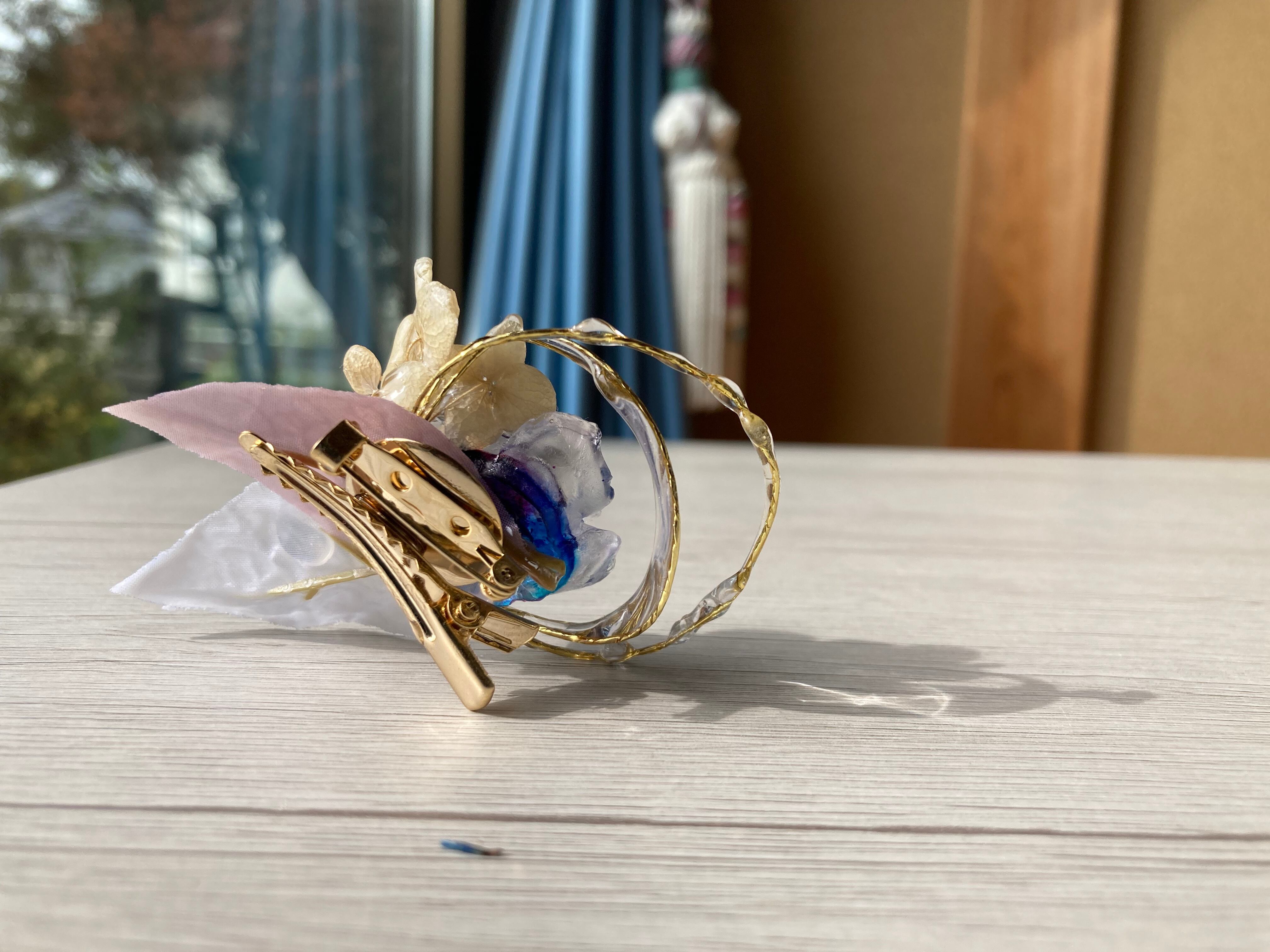 ・衣服を着用前に取り付ける事をおすすめします。また、取り付けの際は頑丈なレジンの花の部分に指を添えて取り付けてください(他の装飾部は繊細な為)