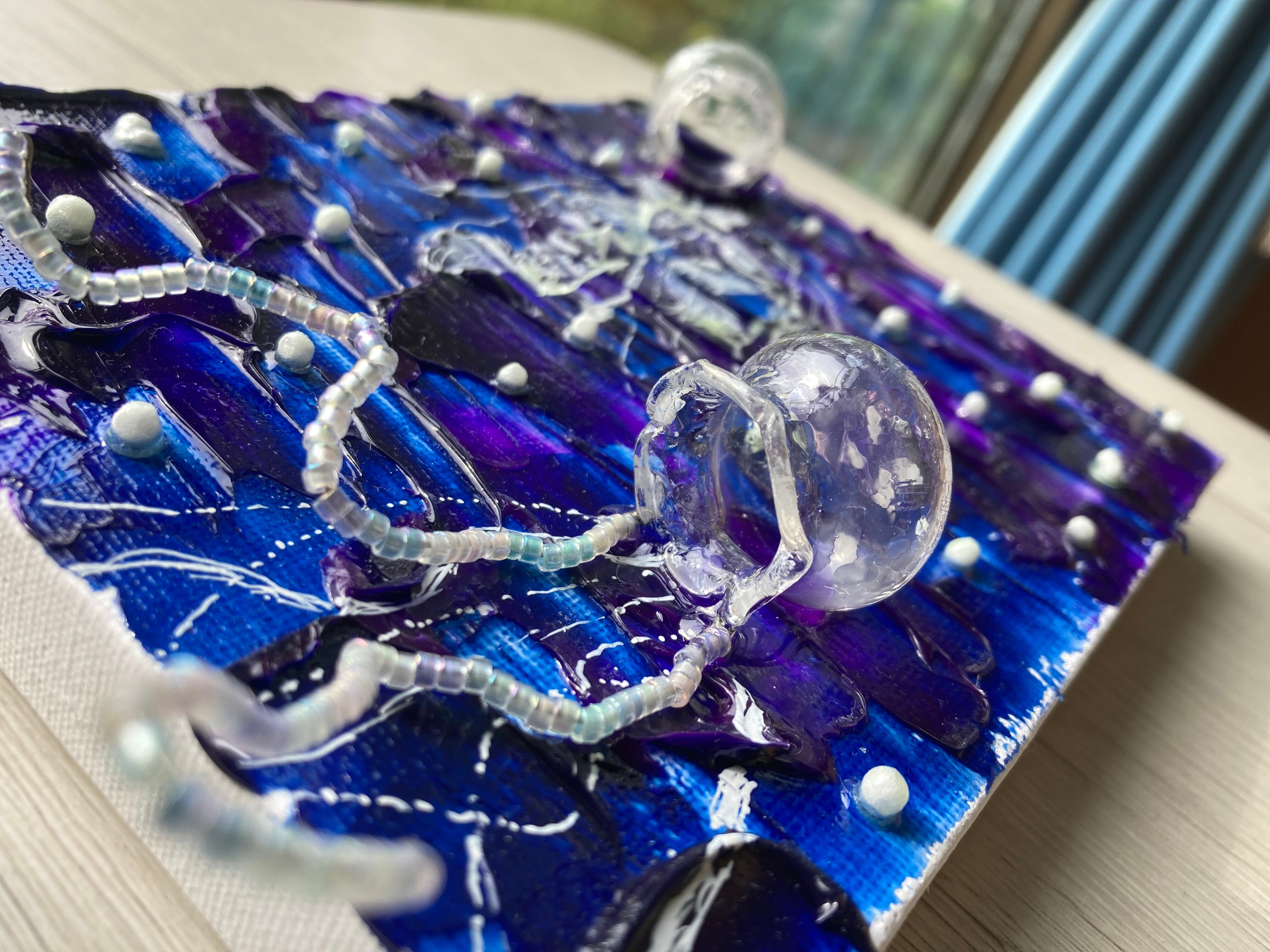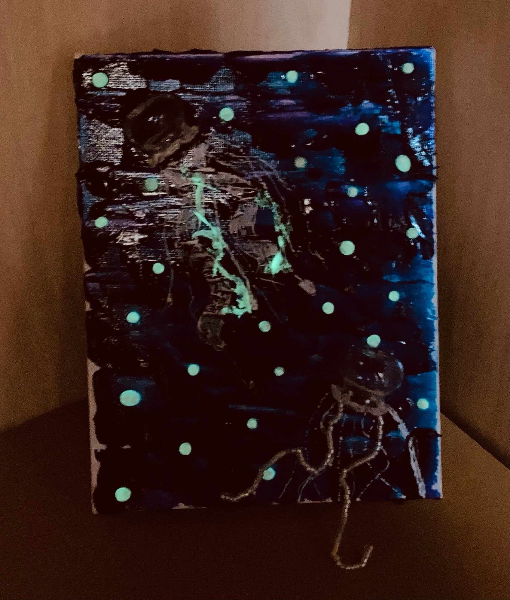 蓄光インクを使って夜の海を幻想的に表現しています。