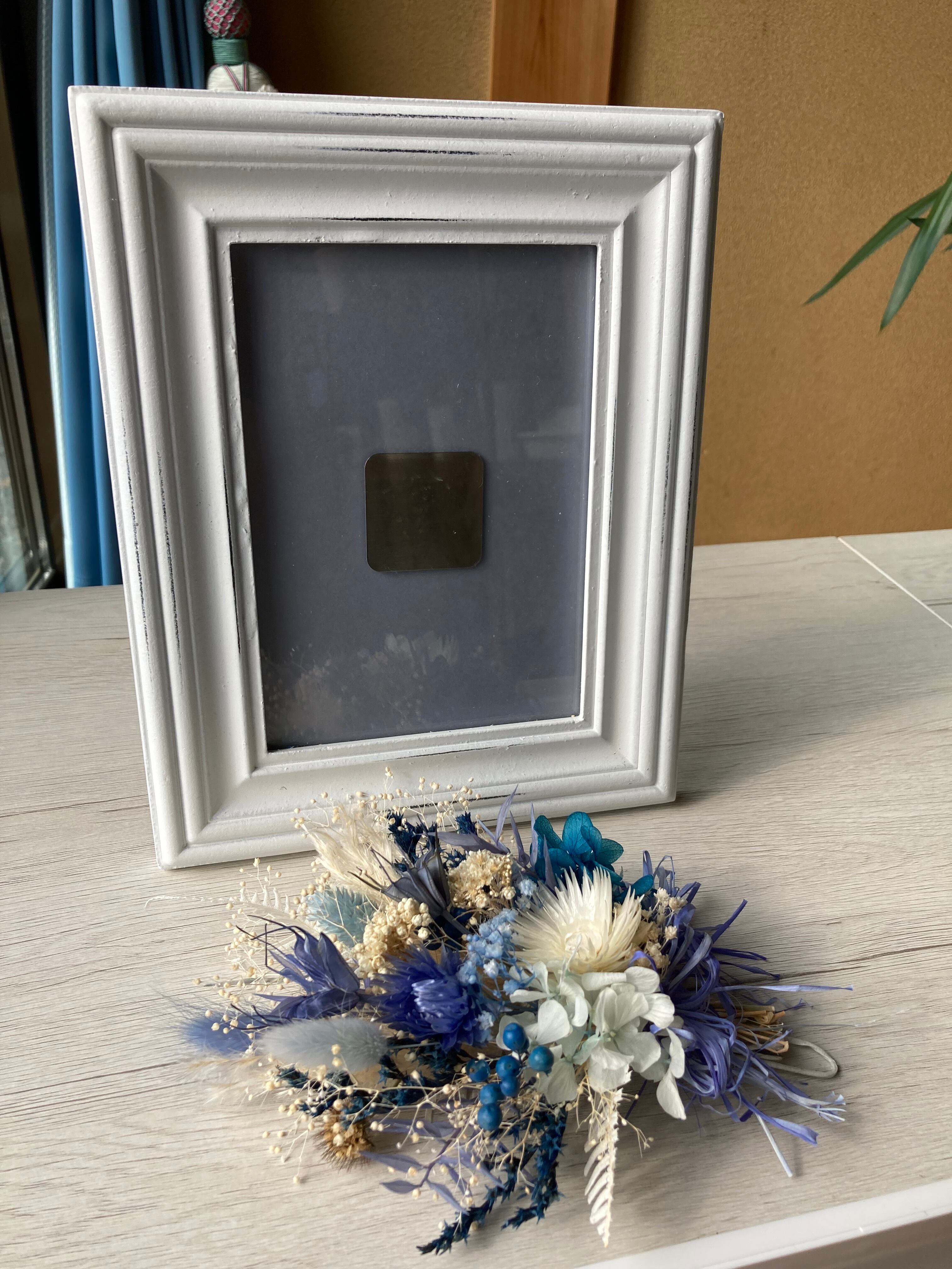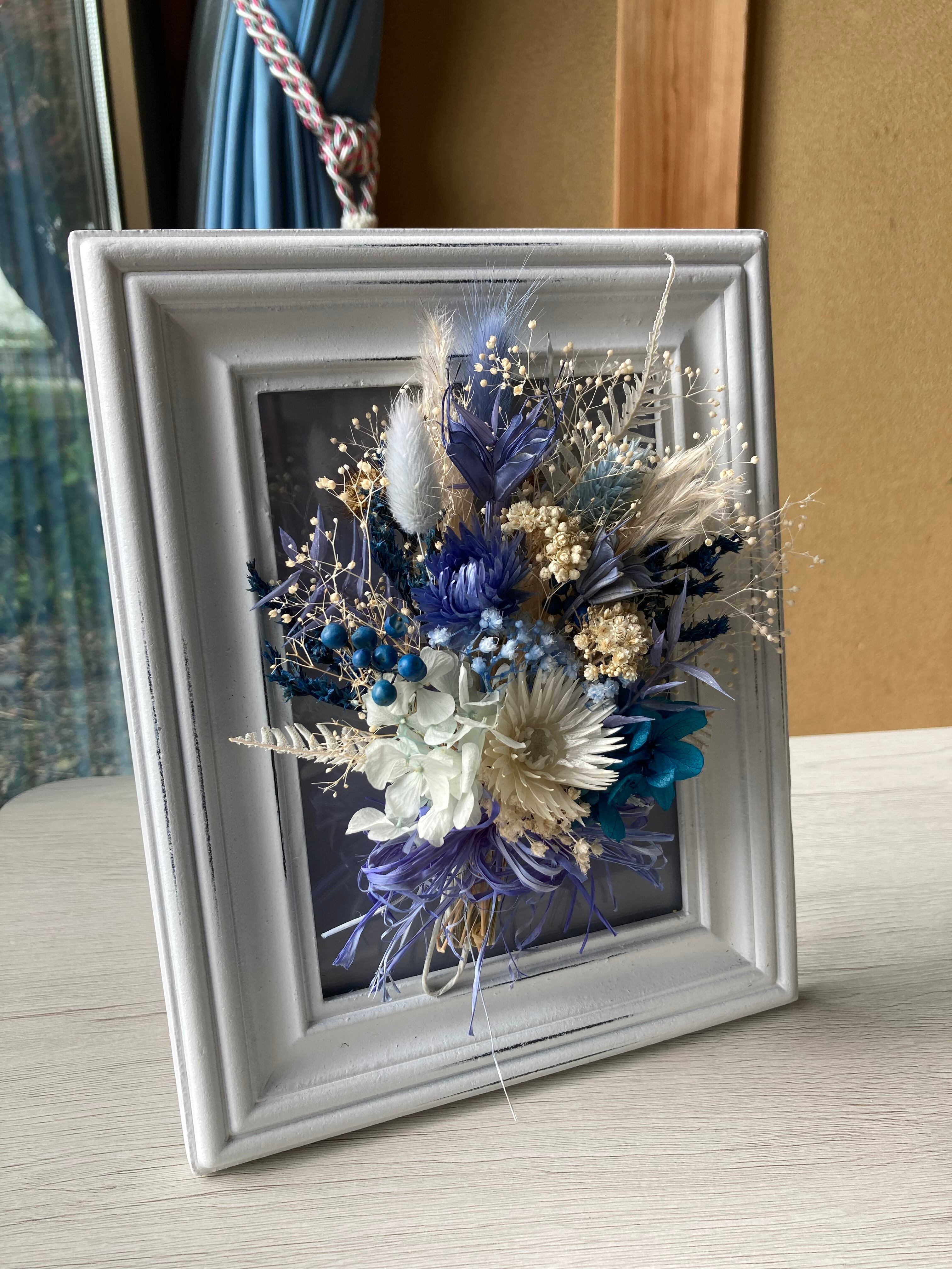 ブルー基調の美しいドライフラワーで出来たアート作品。