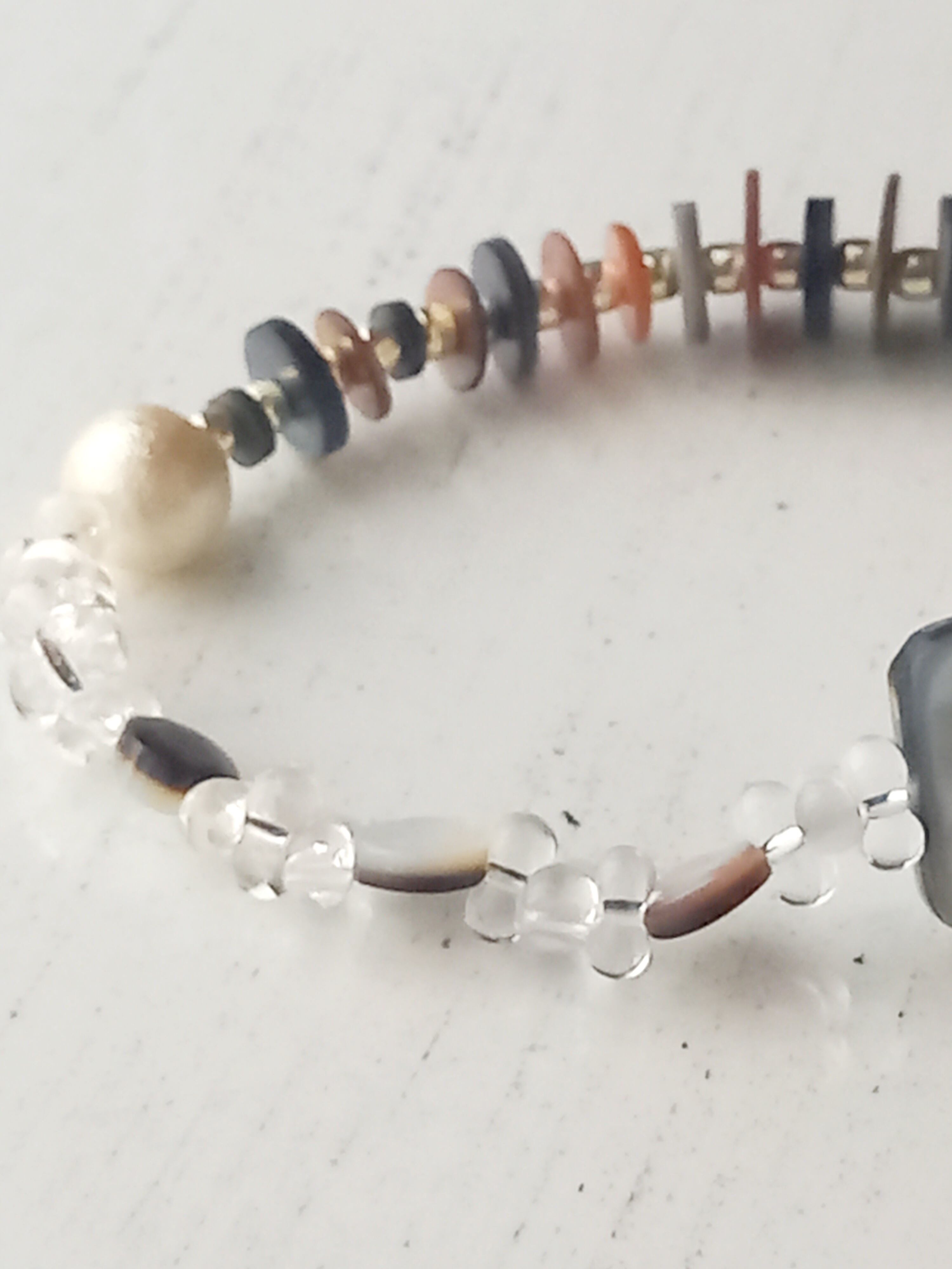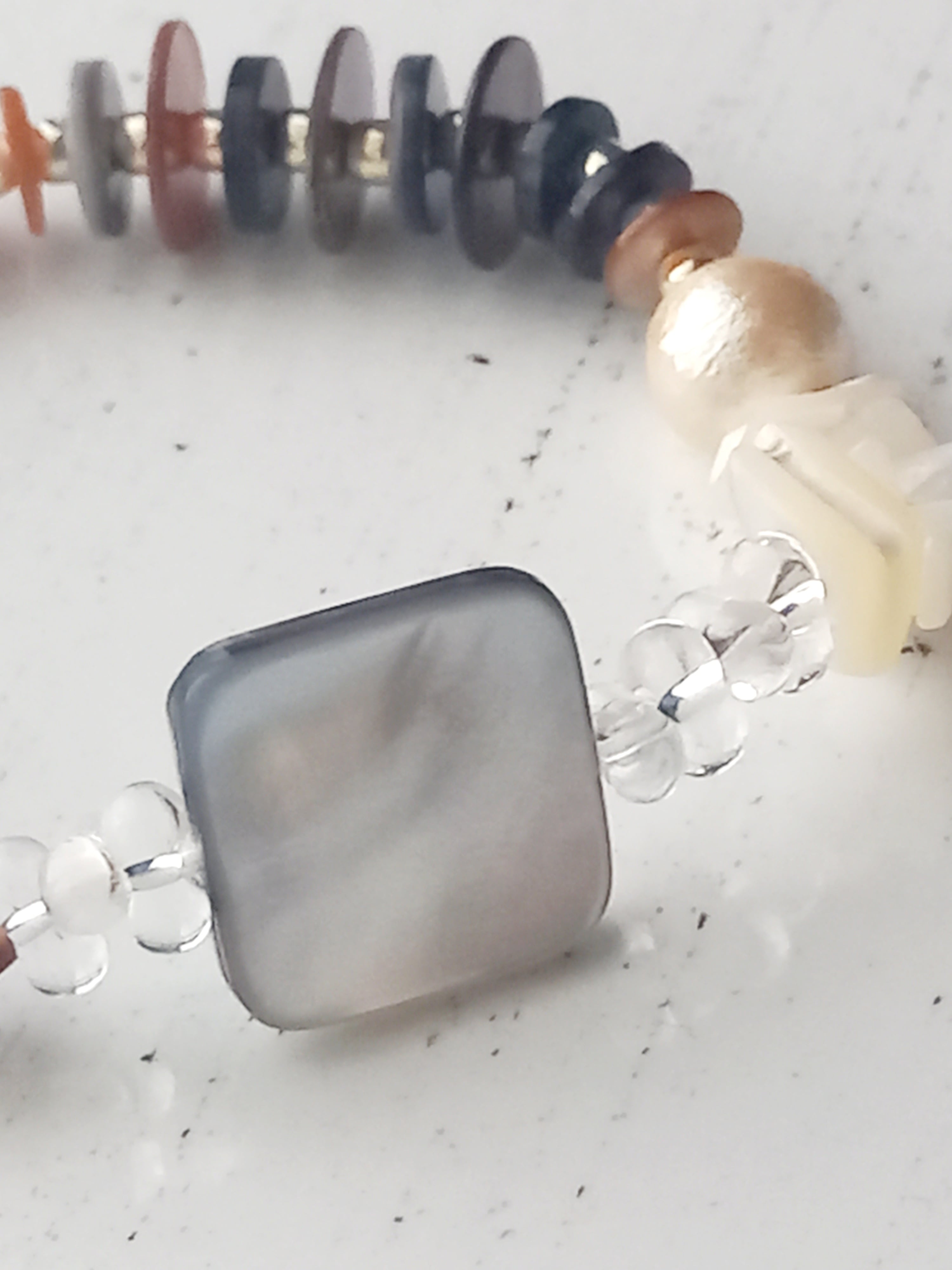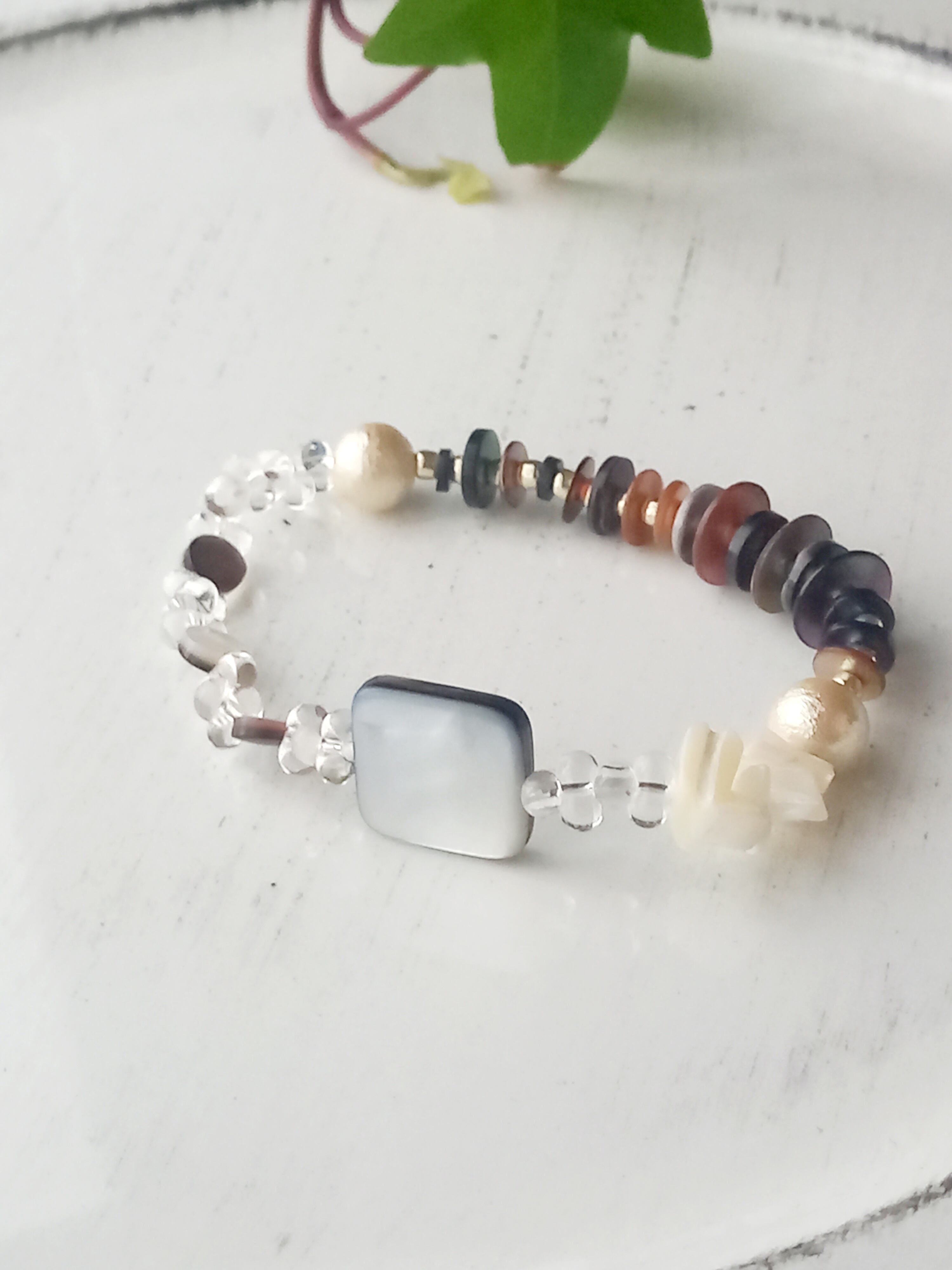 スクエアモチーフがアクセントの様々なシェルパーツ(人工シェル含む)を加えた洗練されたデザインのブレスレットです。
